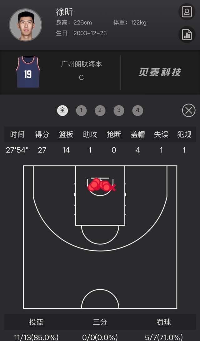 - 生涯之夜!徐昕奉献27分14篮板4帽统治级表现,命中率高达85%